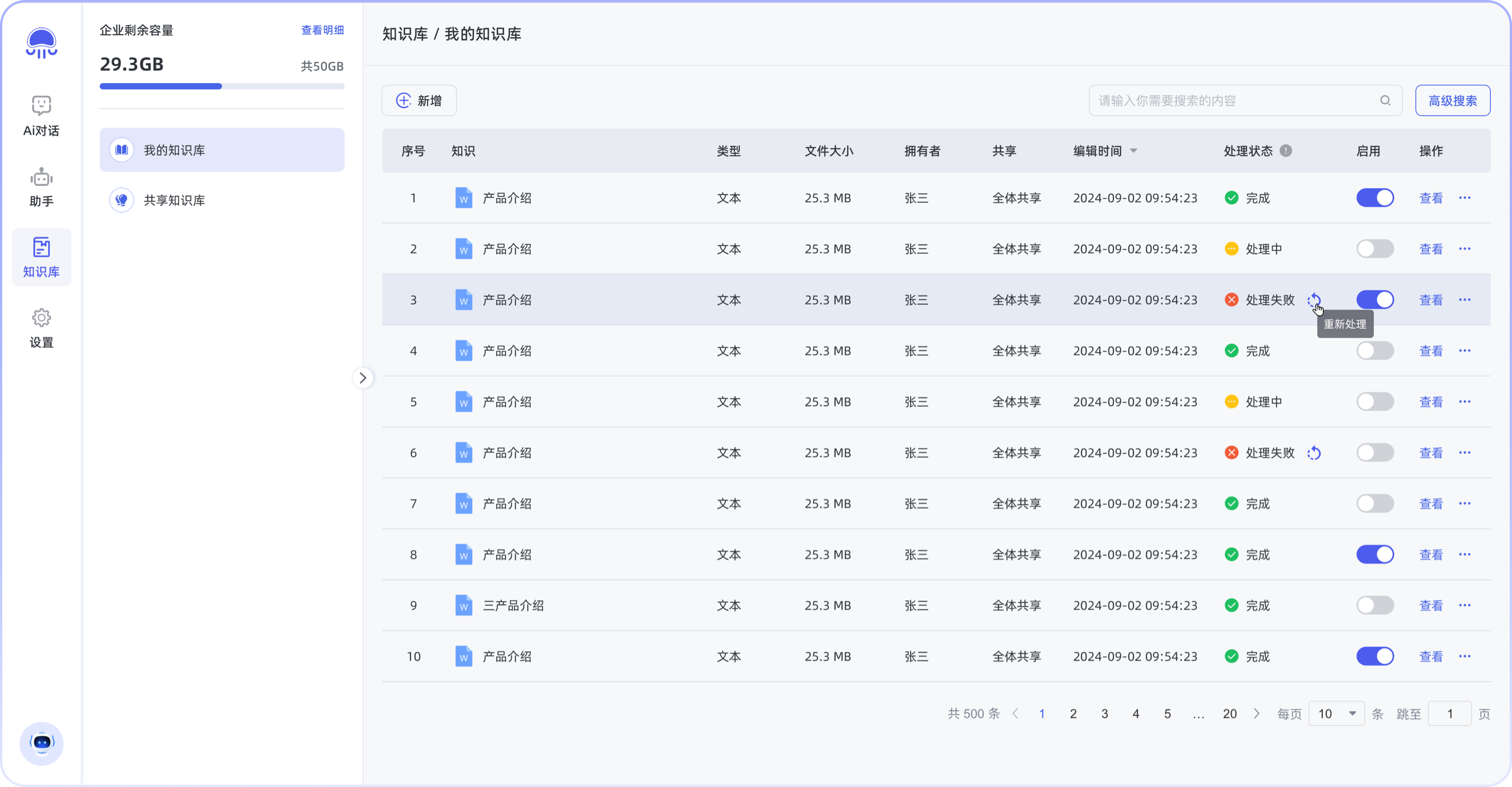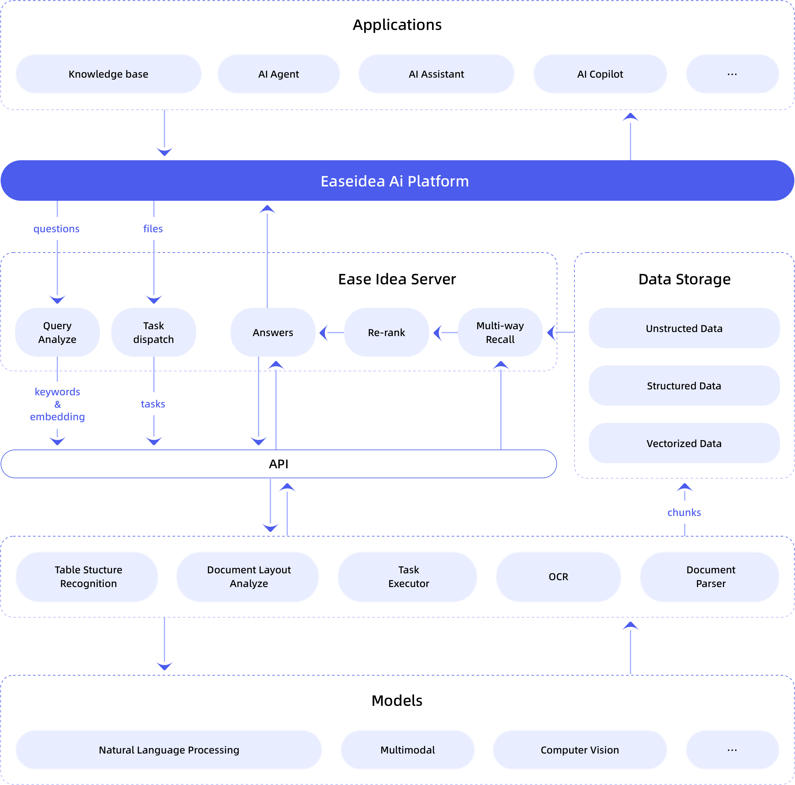 支持多种文件格式智能解析(包含PDF/Word/Excel/PPT/扫描件/音视频),通过多模态OCR与语义分割技术,实现非结构化数据到结构化知识的自动转化。配合版本化知识管理,确保企业知识库能够实时同步业务变化,解决“数据沉睡”的难题。